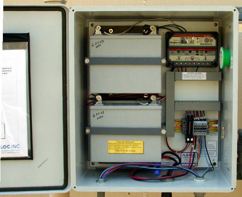 The POWERPAK provides constant DC operating power for each motorized valve actuator in the system. As the power is used, the batteries are constantly recharged by Solar. Standard battery size is 12 Volts DC at 31 Ah, connected in series to provide 24 Volts DC. Should the charging system fail, the fully charged batteries will allow approximately 90 minutes of single valve actuator operation (Consult FLO-LOC for individual value operational specifications). If a typical valve open/close cycle takes six minutes, a fully charged POWERPAK will allow at least 10 full cycles over a period of days or weeks before recharging.